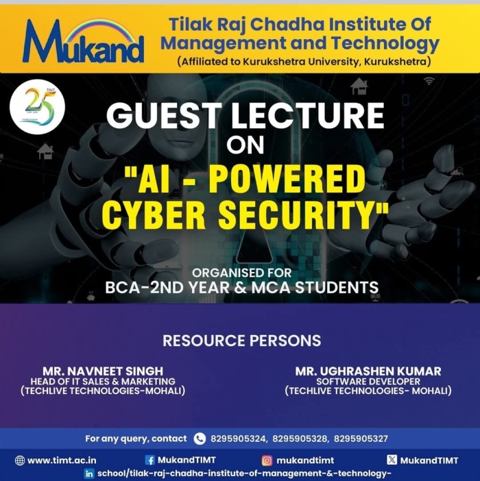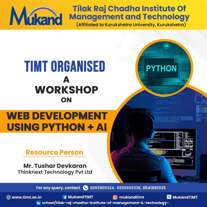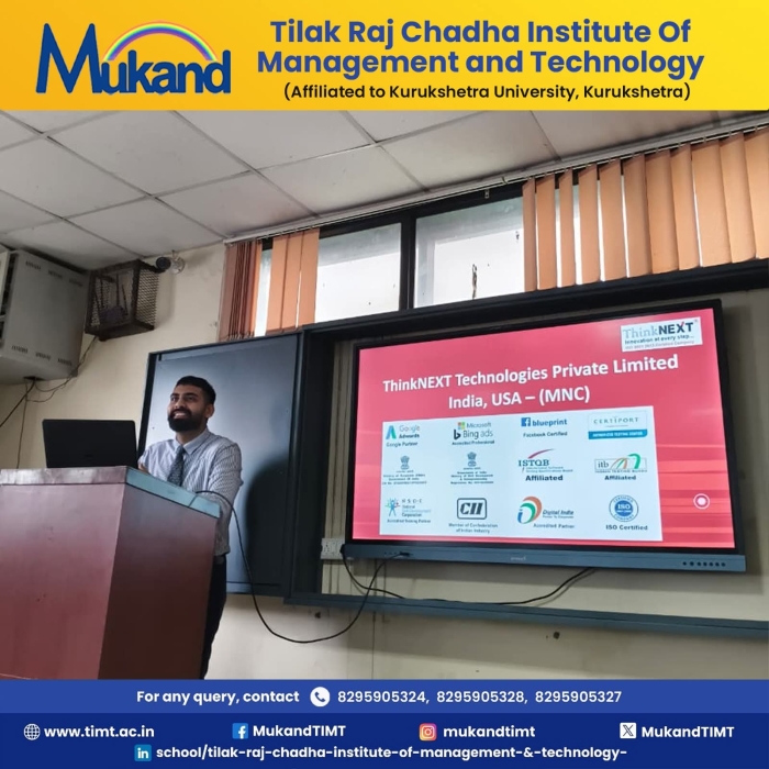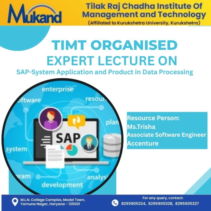 • Guest Lecture Organised on Generative AI for Computer Application Students      • Placement- 09 Students got placed in ICICI Bank       • SYNERGY 2K26 Fest Held on 9th - 10th feb 2026 in TIMT Campus      • Felicitation Ceremony --- Computer Applications Department held on November 26,2025      • Felicitation Ceremony --- Management Department held on November 21,2025      • Wipro Placement : 5 BCA & 4 BBA students selected- Congratulations !      • Proud Moment : 19 BCA students got selected in Infosys      • Guest Lecture on" The New Age Manager" held for MBA & BBA      • AI-Cyber Security session held for BCA & MCA       • Expert session on Digital Marketing for MBA & BBA      • Talent Show 2025 : Literary Events on 19 September,2025 and Cultural Events on 20 September,2025      • Hike Education Campus Placement Drive at TIMT on 16 September,2025      • Swachhta Pakhwada Plantation Drive held at TIMT on September 15,2025      • TIMT celebrates National Sports Day on 30th Aug 2025      • Campus Placement Drive at TIMT for MBA & BBA Students – Learning Routes      • TIMT Organised Workshop on Web Development using Python and AI      • KUK Inspection To Be Held On 13th May 2025      • 15th Blood Donation Mela held at TIMT on 29th March 2025      • Felicitation Ceremony --- Computer Applications Department held on November 26,2025      • Industrial visit for MCA (Previous & Final Year) students to Grazitti Interactive held on 26th March 2025.      • Industrial visit to Yakult Danone India Pvt. Ltd. Organized by Department of Management for BBA 2nd semester students      • BCA-5th sem- Top 10 University Positions secured      • MBA-3RD SEM- Top University Positions Attained by MBA Achieveres      • TIMT celebrates 111th Birth Anniversary of Prof. Tilak Raj Chadha (Bapu Ji) on 14th Dec,2025 at 11 am in MLN Auditorium      • BBA 5th sem -Top 3 out of 10 university positions secured      • International Womens Day- Guest talk by Dr. Suman Masih      • Pisoft Informatics Pvt Ltd - Organised for Management & Computer Applications Students      • Inter Departmental ELOCUTION Competition organized by Management Department       • Guest Lecture on Roadmap to IT held for MCA/BCA      • Tech Sphere 2.0 2k25 Held on March 3rd & 4th       • BCA 6th Sem students embarked on a thrilling Shimla       • An Engaging Interactive Session for MBA & BBA Students at TIMT      • Infosys Placement: 6 students of BCA selected in Infosys      • Wipro Placement : 2 students of management and 4 students of Computer application selected in Wipro.      • February 22nd 2025 - BCA 6th Sem students embarked on a thrilling Shimla tour       • Placement Drive held for Management and Computer Application on 17th January,2025      • Campus Drive for Estreet IT Solutions Pvt Ltd- MBA/BBA      • The guest lecture on ’Achieving Excellence Through Self-Management’ by Dr. Navneet Arora, esteemed Professor at IIT Roorkee      • National Youth Festival 2025 -proud BBA Student : Ms. Anshika Kathuria, who actively participated in the Viksit Bharat Young Leaders Dialogue 2025      • Industrial visit for MCA (Previous & Final Year) students to Grazitti Interactive held on 26th March 2025.      • Celebrated Seth Mukand Lal Ji Birthday on 5th Jan       • Campus Placement Drive - Grazitti Interactive to be held on November 25,2024.       • MSME Development Guest Lecture on Entrepreneurship and Various Schemes      • Joint Placement Drive - Infinity Education       • 5-Days DSA Workshop held by Tech Warriors Club       • Freshers Held for Management department on 1st Sep 2024       • Registration Open!! BBA, BCA, MCA, MBA- 2024      • KUK Inspection to be held on 29th March 2024      • Women’s day Celebration - March 7,2024      • Industrial Visit-Saraswati Sugar Mill held for BBA 2nd sem      • Registration Open!! BBA, BCA, MCA, MBA- 2024      • Guest Lecture-Mental Healh Wellbeing      • Inter College Quiz Competition-2024       • Inter- College Quiz Prelim Round 2024      • Expert Talk- Impact of AI      • IBM Skillset build session on 23rd Jan 2024      • Felicitation Ceremony -Nov 24th 2023(Comp. App)      • Empowering Youth for a Progressive Nation: Yuva Samwad Workshop      • TIMT Hosts Insightful Guest Lecture by Capitalline on Financial Markets and Investment Strategies      • Faculty Requirement Open MBA, BBA, BCA, MCA      • Felicitation Ceremony Even Sem 2023 held from May 15,2023 to May 17,2023      • Sixteen Students of BBA/ MBA Selected for Training in Times of India      • Blood Donation Mela - 2023 collected 230 units of Blood at TIMT.       • BCA / MCA Industrial Visit: Debut InfoTech Mohali      • TIMT| Approved by All India Council For Technical Education (AICTE) & Department of Technical Education (DTE) , Haryana.      • Affiliated to Kurukshetra University (A Grade NAAC Accredited), Kurukshetra - Haryana      • Advisory issued by MHA and GoI on Secure use of Zoom App