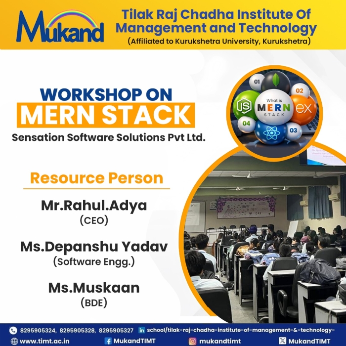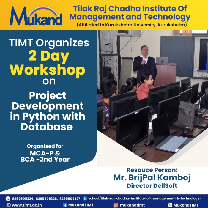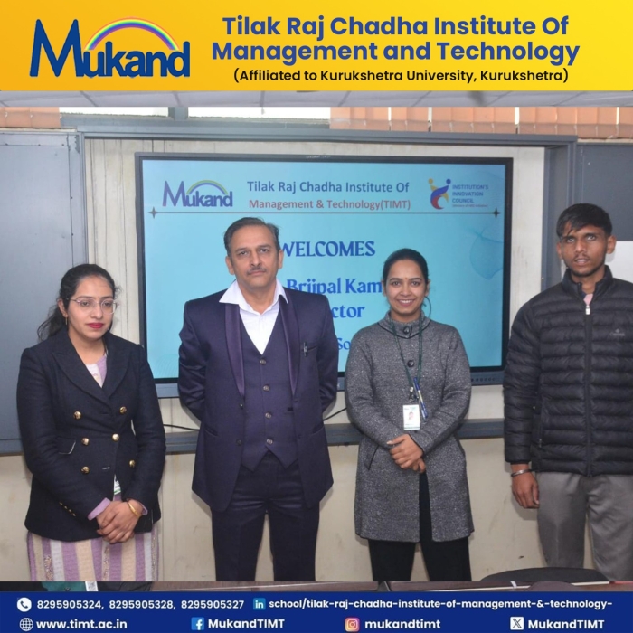 • TIMT Organises A 3-Day Free Eye Care Camp       • 11 BCA Students Selected in Deloitte      • Industrial Visit To YAKULT DANONE INDIA Pvt Ltd organized for Management Students      • TIMT Celebrates 16th Blood Donation Mela on 30th March 2026      • Guest Lecture on " Entrepreneurship " organised for Management Students      • Industrial Visit to Devsoft Pvt Ltd, Mohali organised for Computer Applications Students      • Proud Moment: 15 Students Bagged Top 2 University Positions : BCA-Final Year      • Workshop on Mern Stack organized for Computer Applications Students      • Intra -Departmental Quiz For Management & Computer Applications      • Expert Talk organized on "Survival To Strength " on Women’s Day      • Guest Lecture Organised on Generative AI for Computer Application Students      • Placement- 09 Students got placed in ICICI Bank       • SYNERGY 2K26 Fest Held on 9th - 10th feb 2026 in TIMT Campus      • Felicitation Ceremony --- Computer Applications Department held on November 26,2025      • Felicitation Ceremony --- Management Department held on November 21,2025      • Wipro Placement : 5 BCA & 4 BBA students selected- Congratulations !      • Proud Moment : 19 BCA students got selected in Infosys      • Guest Lecture on" The New Age Manager" held for MBA & BBA      • AI-Cyber Security session held for BCA & MCA       • Expert session on Digital Marketing for MBA & BBA      • Talent Show 2025 : Literary Events on 19 September,2025 and Cultural Events on 20 September,2025      • Hike Education Campus Placement Drive at TIMT on 16 September,2025      • Swachhta Pakhwada Plantation Drive held at TIMT on September 15,2025      • TIMT celebrates National Sports Day on 30th Aug 2025      • Campus Placement Drive at TIMT for MBA & BBA Students – Learning Routes      • TIMT Organised Workshop on Web Development using Python and AI      • KUK Inspection To Be Held On 13th May 2025      • 15th Blood Donation Mela held at TIMT on 29th March 2025      • Felicitation Ceremony --- Computer Applications Department held on November 26,2025      • Industrial visit for MCA (Previous & Final Year) students to Grazitti Interactive held on 26th March 2025.      • BCA-5th sem- Top 10 University Positions secured      • MBA-3RD SEM- Top University Positions Attained by MBA Achieveres      • TIMT celebrates 111th Birth Anniversary of Prof. Tilak Raj Chadha (Bapu Ji) on 14th Dec,2025 at 11 am in MLN Auditorium      • BBA 5th sem -Top 3 out of 10 university positions secured      • International Womens Day- Guest talk by Dr. Suman Masih      • Pisoft Informatics Pvt Ltd - Organised for Management & Computer Applications Students      • Inter Departmental ELOCUTION Competition organized by Management Department       • Guest Lecture on Roadmap to IT held for MCA/BCA      • Tech Sphere 2.0 2k25 Held on March 3rd & 4th       • BCA 6th Sem students embarked on a thrilling Shimla       • An Engaging Interactive Session for MBA & BBA Students at TIMT      • Infosys Placement: 6 students of BCA selected in Infosys      • Wipro Placement : 2 students of management and 4 students of Computer application selected in Wipro.      • February 22nd 2025 - BCA 6th Sem students embarked on a thrilling Shimla tour       • Placement Drive held for Management and Computer Application on 17th January,2025      • Campus Drive for Estreet IT Solutions Pvt Ltd- MBA/BBA      • The guest lecture on ’Achieving Excellence Through Self-Management’ by Dr. Navneet Arora, esteemed Professor at IIT Roorkee      • National Youth Festival 2025 -proud BBA Student : Ms. Anshika Kathuria, who actively participated in the Viksit Bharat Young Leaders Dialogue 2025      • Industrial visit for MCA (Previous & Final Year) students to Grazitti Interactive held on 26th March 2025.      • Celebrated Seth Mukand Lal Ji Birthday on 5th Jan       • Campus Placement Drive - Grazitti Interactive to be held on November 25,2024.       • MSME Development Guest Lecture on Entrepreneurship and Various Schemes      • Joint Placement Drive - Infinity Education       • 5-Days DSA Workshop held by Tech Warriors Club       • Freshers Held for Management department on 1st Sep 2024       • Registration Open!! BBA, BCA, MCA, MBA- 2024      • KUK Inspection to be held on 29th March 2024      • Women’s day Celebration - March 7,2024      • Industrial Visit-Saraswati Sugar Mill held for BBA 2nd sem      • Registration Open!! BBA, BCA, MCA, MBA- 2024      • Guest Lecture-Mental Healh Wellbeing      • Inter College Quiz Competition-2024       • Inter- College Quiz Prelim Round 2024      • Expert Talk- Impact of AI      • IBM Skillset build session on 23rd Jan 2024      • Felicitation Ceremony -Nov 24th 2023(Comp. App)      • Empowering Youth for a Progressive Nation: Yuva Samwad Workshop      • TIMT Hosts Insightful Guest Lecture by Capitalline on Financial Markets and Investment Strategies      • Faculty Requirement Open MBA, BBA, BCA, MCA      • Felicitation Ceremony Even Sem 2023 held from May 15,2023 to May 17,2023      • Sixteen Students of BBA/ MBA Selected for Training in Times of India      • Blood Donation Mela - 2023 collected 230 units of Blood at TIMT.       • BCA / MCA Industrial Visit: Debut InfoTech Mohali      • TIMT| Approved by All India Council For Technical Education (AICTE) & Department of Technical Education (DTE) , Haryana.      • Affiliated to Kurukshetra University (A Grade NAAC Accredited), Kurukshetra - Haryana      • Advisory issued by MHA and GoI on Secure use of Zoom App